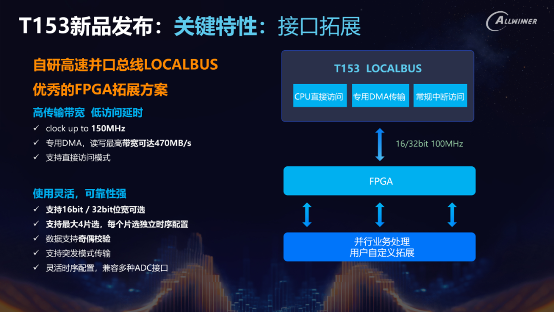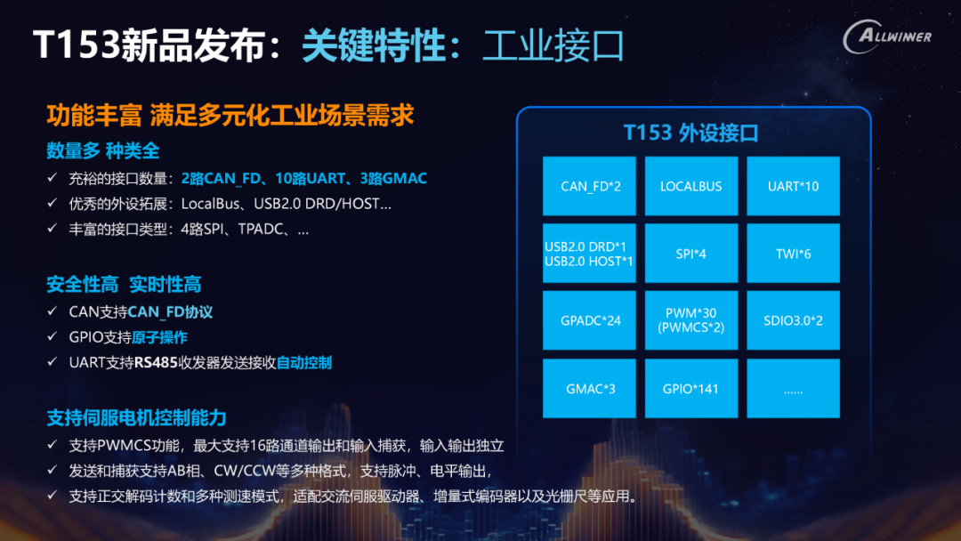 同时,T153也展现出面向智慧工业场景的高扩展性。T153配备3路千兆以太网接口、2路CAN-FD接口和LocalBus接口,可满足工业设备高吞吐量网络连接以及复杂数据驱动的多元化场景需求。此外,T153还提供24个GPADC、6个TWI接口、30个PWM等丰富接口,为多样化应用提供灵活性,实现自动化系统的便捷集成与扩展。