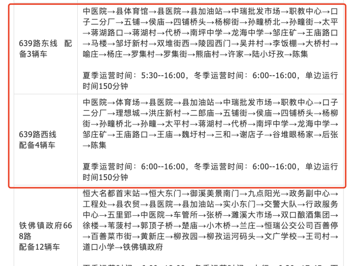 上游新闻记者在濉溪县政府官网检索发现,639路公交东线、西线均起于中医院站,终点为陈集场站,冬季运营时间为每天6:00至16:00,单边运行时间约150分钟。